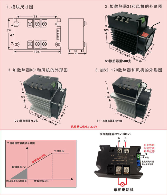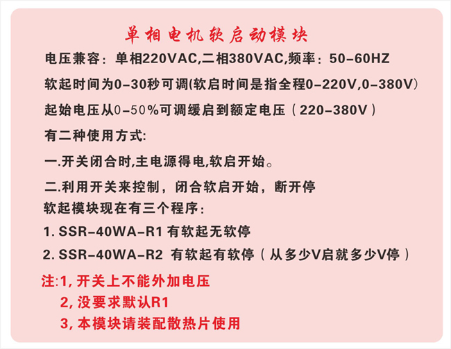 用途:水泵,风机,航车,自耦变压器等及普通单相电机软启动,替代可调自耦变压器,变频器软启动等,接线简单, 不用接旁路接触器,经济实用,填补同类产品空白。