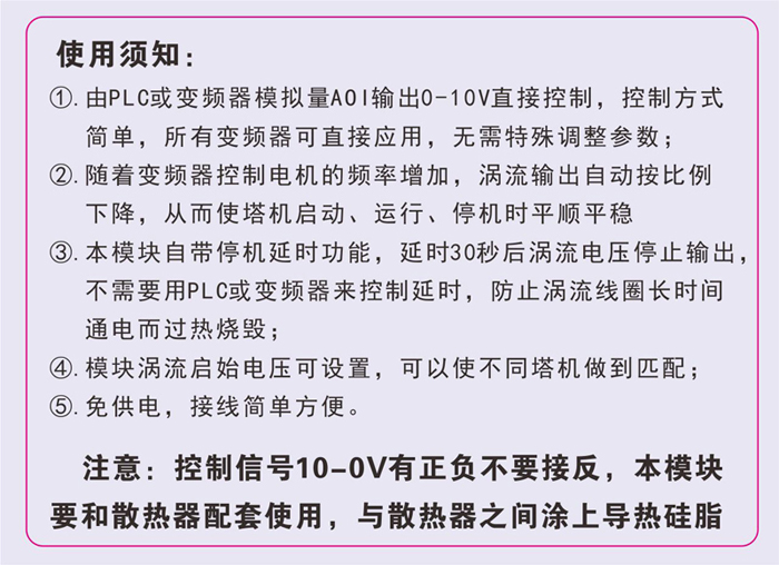 塔机回转涡流模块(塔机回转涡流控制器)是提供可调节电压的一种装装置。涡流模块由PLC控制配合不同信号分别输出不同大小的直流电压,达到回压回转速度,完好地解决了:塔机在运转速度、塔机再运转难、启动时间长、回转停车时塔机晃动较大、工作一段时间后回转电机发热严重的难题。