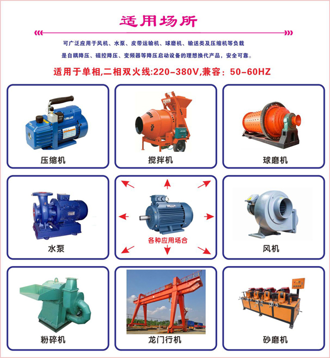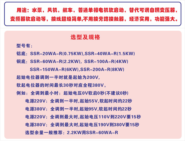 用途:水泵,风机,航车,自耦变压器等及普通单相电机软启动,替代可调自耦变压器,变频器软启动等,接线简单, 不用接旁路接触器,经济实用,填补同类产品空白。